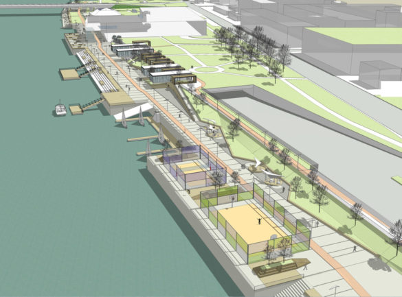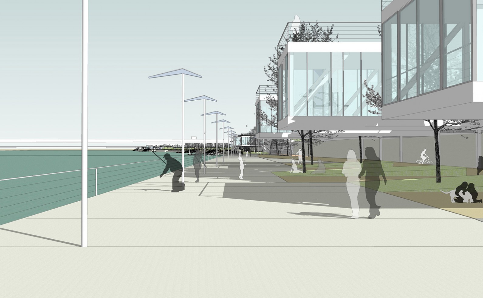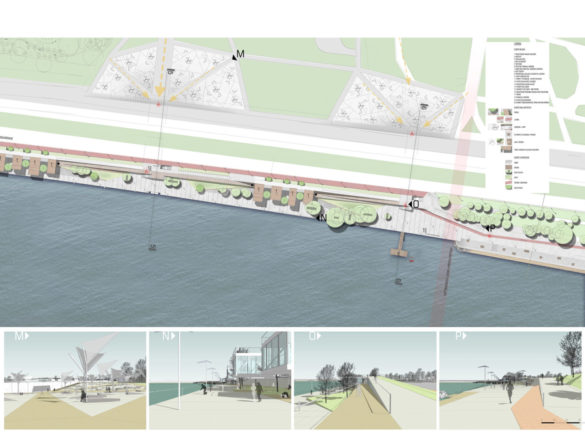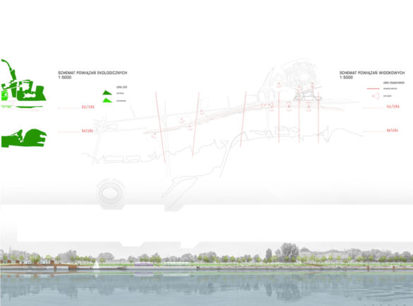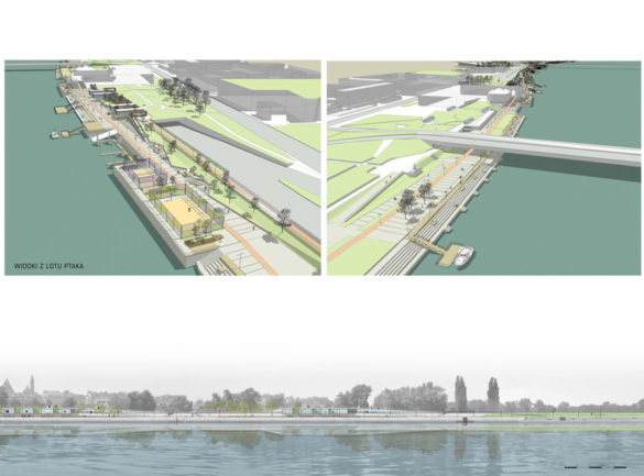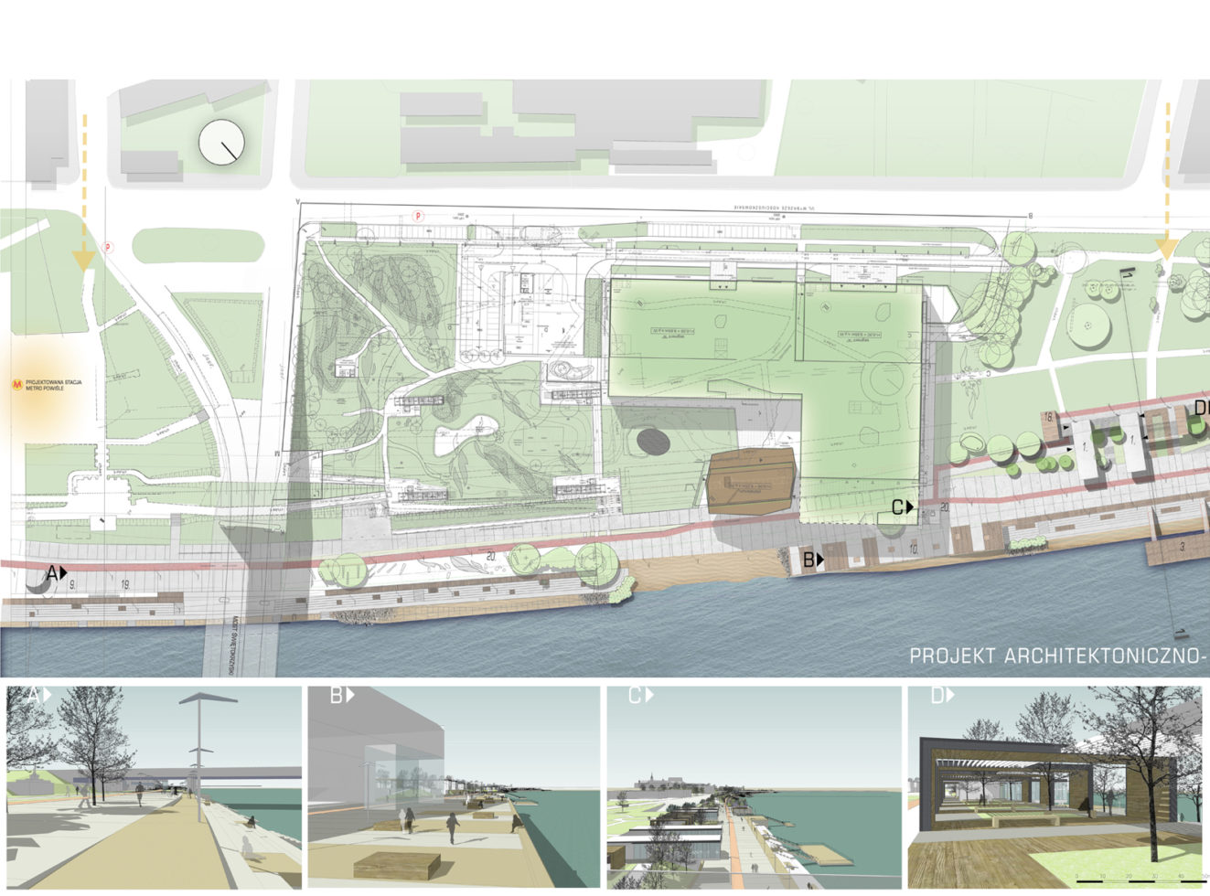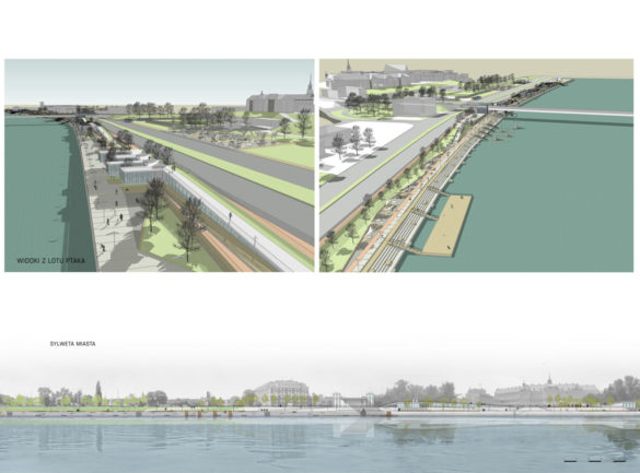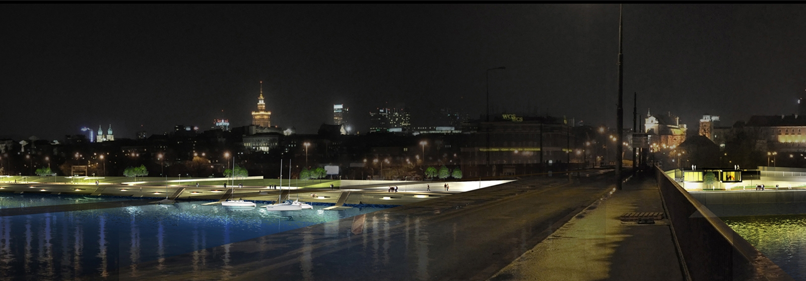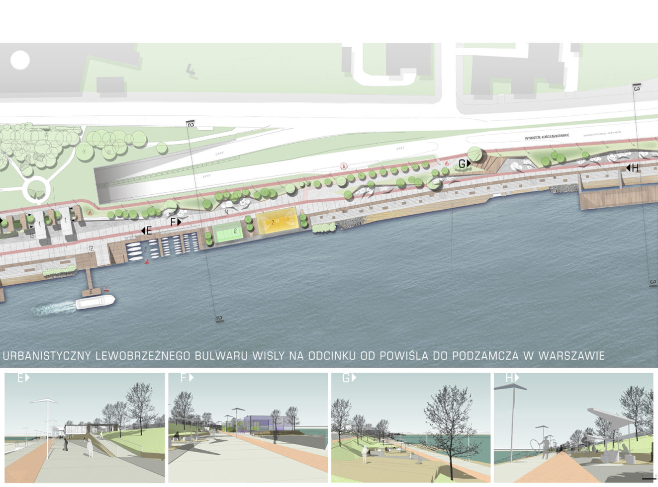 Tematem konkursu było opracowanie projektu architektoniczno – urbanistycznego lewobrzeżnego bulwaru Wisły, na odcinku od Powiśla do Podzamcza w Warszawie. Jednym z głównych problemów tego miejsca był brak atrakcyjnego zagospodarowania oraz Wisłostrada, skutecznie odcinająca swobodny dostęp do rzeki. W projekcie zdecydowano się powiązać organicznie bulwar Wisły z miastem, umożliwiając swobodną, bezkolizyjną komunikację pomiędzy Starym Miastem, Podzamczem i Powiślem. Dodatkowo zapewniono atrakcyjne zagospodarowanie brzegu rzeki będące magnesem dla mieszkańców oraz turystów. W projekcie założono adaptację istniejących przejść podziemnych w rejonie Podzamcza, wykonanie dodatkowego przejścia pod Wisłostradą i tarasu widokowego. Dodatkowo zlokalizowano nowe przystanki komunikacji miejskiej na moście Śląsko- oraz lokalizację przejścia dla pieszych na wylocie ul. Nowy Zjazd.