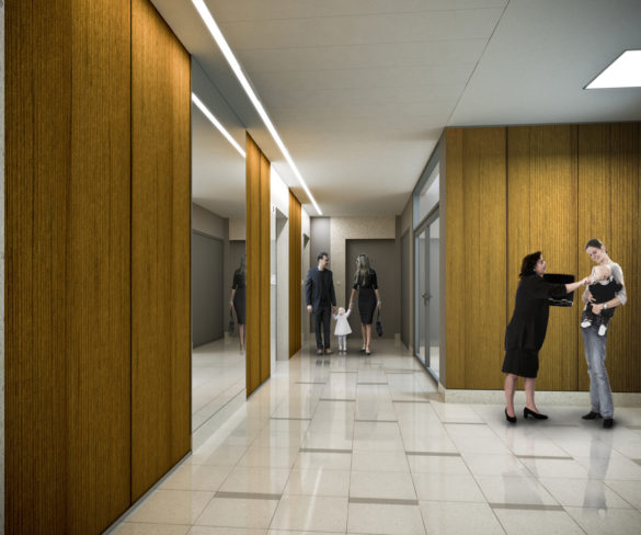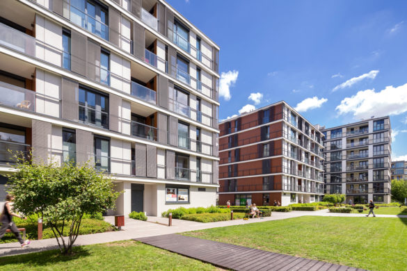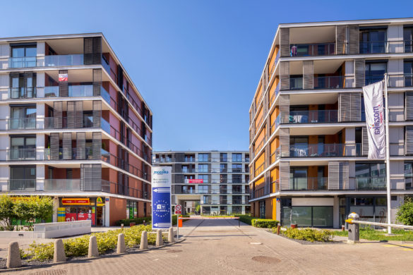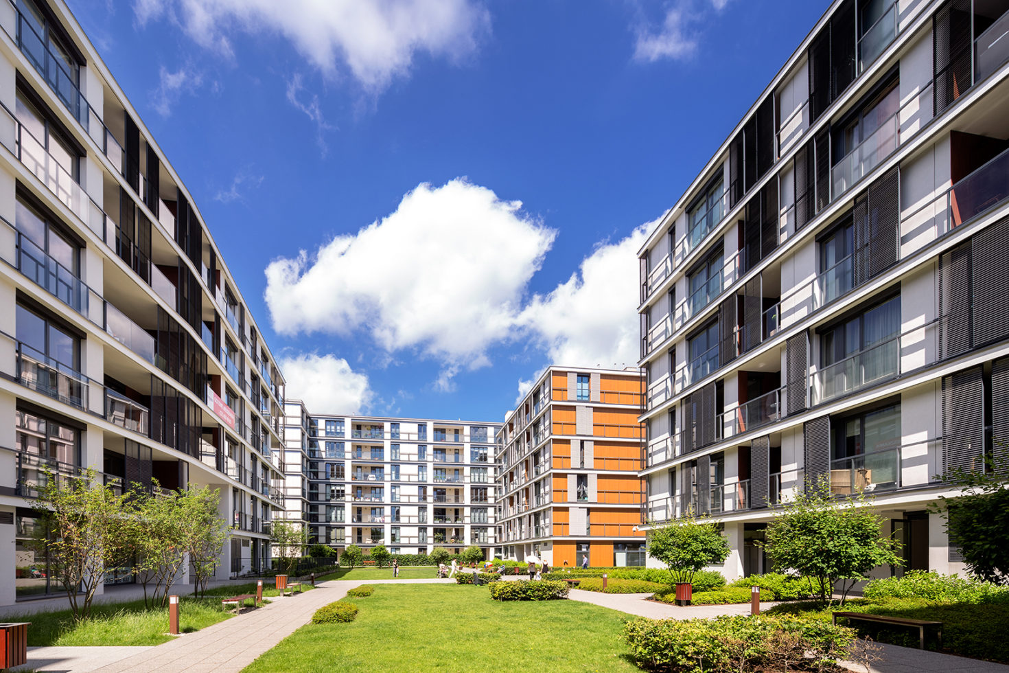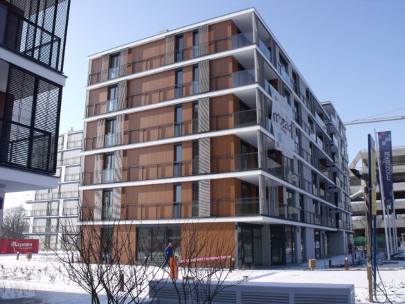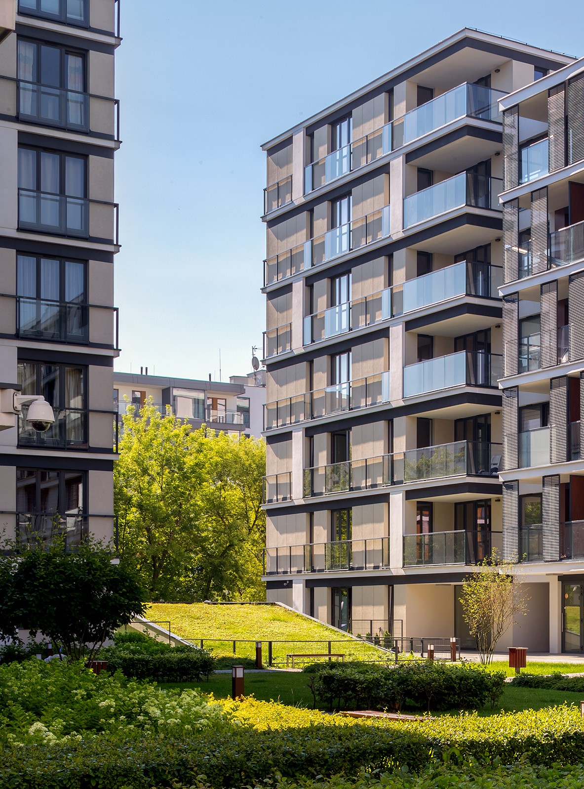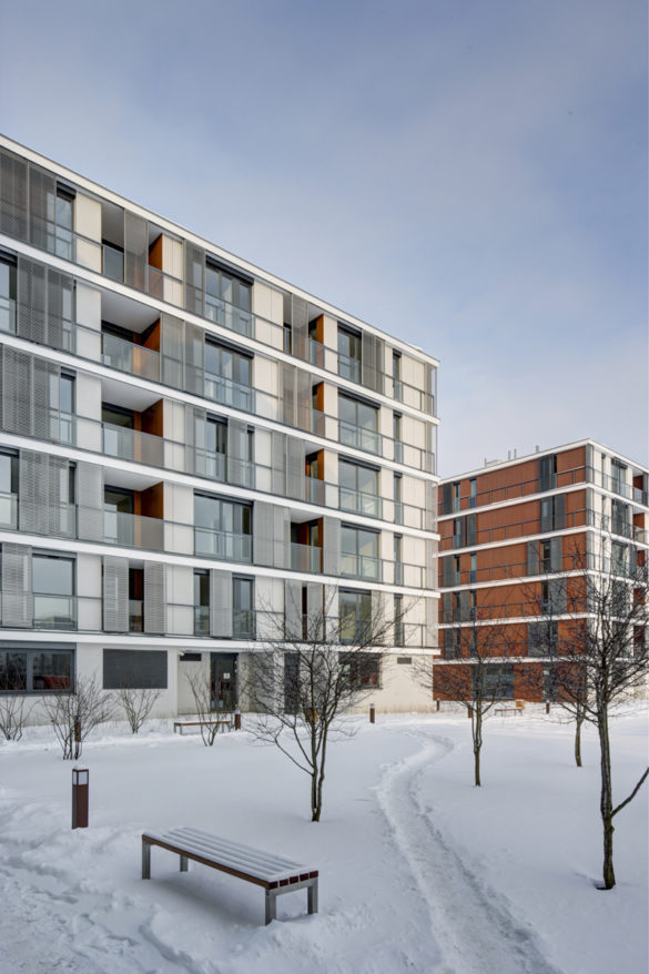 Główną zasadę projektową zrealizowaliśmy poprzez ukształtowanie siedmiokondygnacyjnych wysokich części zewnętrznych całego kompleksu, i domknięcie ich w wyraźne ramy, odcinające się w bryle budynku zarówno kolorystycznie, jak i materiałowo.