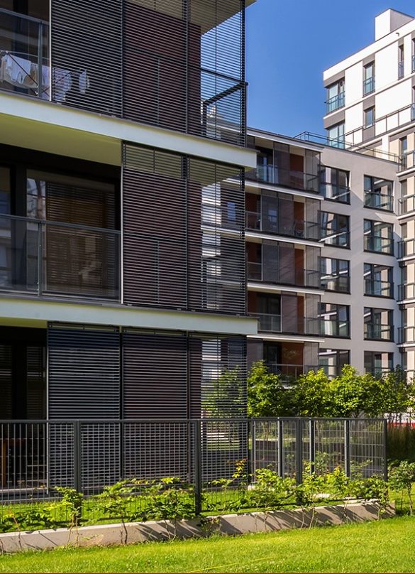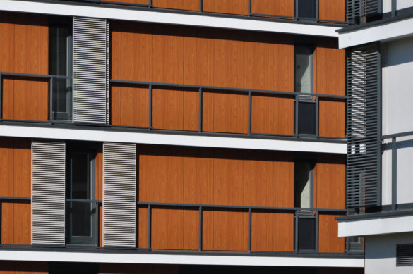Poziome linie stropów, wyznaczyły  rytm i określiły granice dla wypełniających je powtarzalnych modułów. Budynki zyskały czytelną zasadę kompozycyjną – stały się układanką zbliżonych do siebie gabarytami elementów, budujących tektonikę elewacji- wysokich drewnianych okien typu porte-fenêtre , ażurowych aluminiowych żaluzji oraz paneli z mlecznego szkła i okładziny o drewnianej fakturze. Geometrycznego rygoru i elegancji dodały elewacjom pasma stalowych balustrad wypełnionych szkłem.
