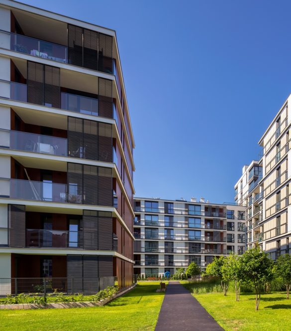 Dominującą funkcją projektowanego zespołu jest funkcja mieszkalna. Na ostatnich kondygnacjach w częściach wyższych umieściliśmy dwupoziomowe penthousy. Strefa przyziemia budynków została częściowo przeznaczona na lokale usługowe, natomiast garaż wraz z pomieszczeniami technicznymi został zlokalizowany w kondygnacji podziemnej.