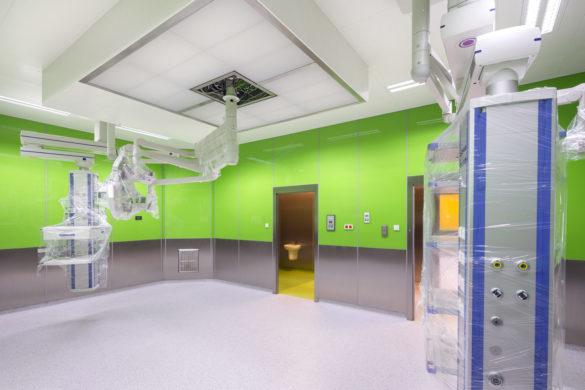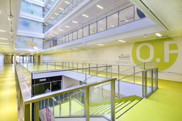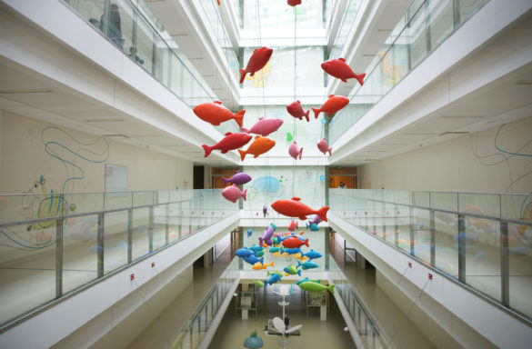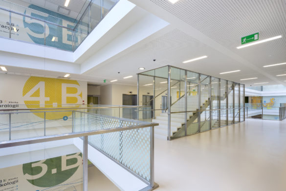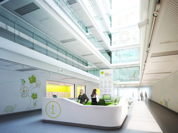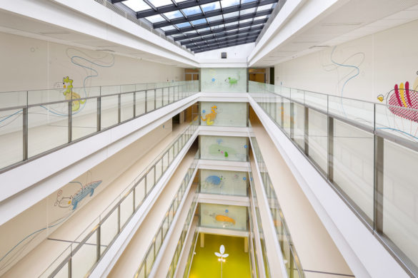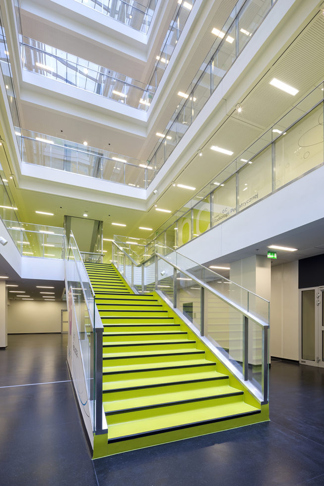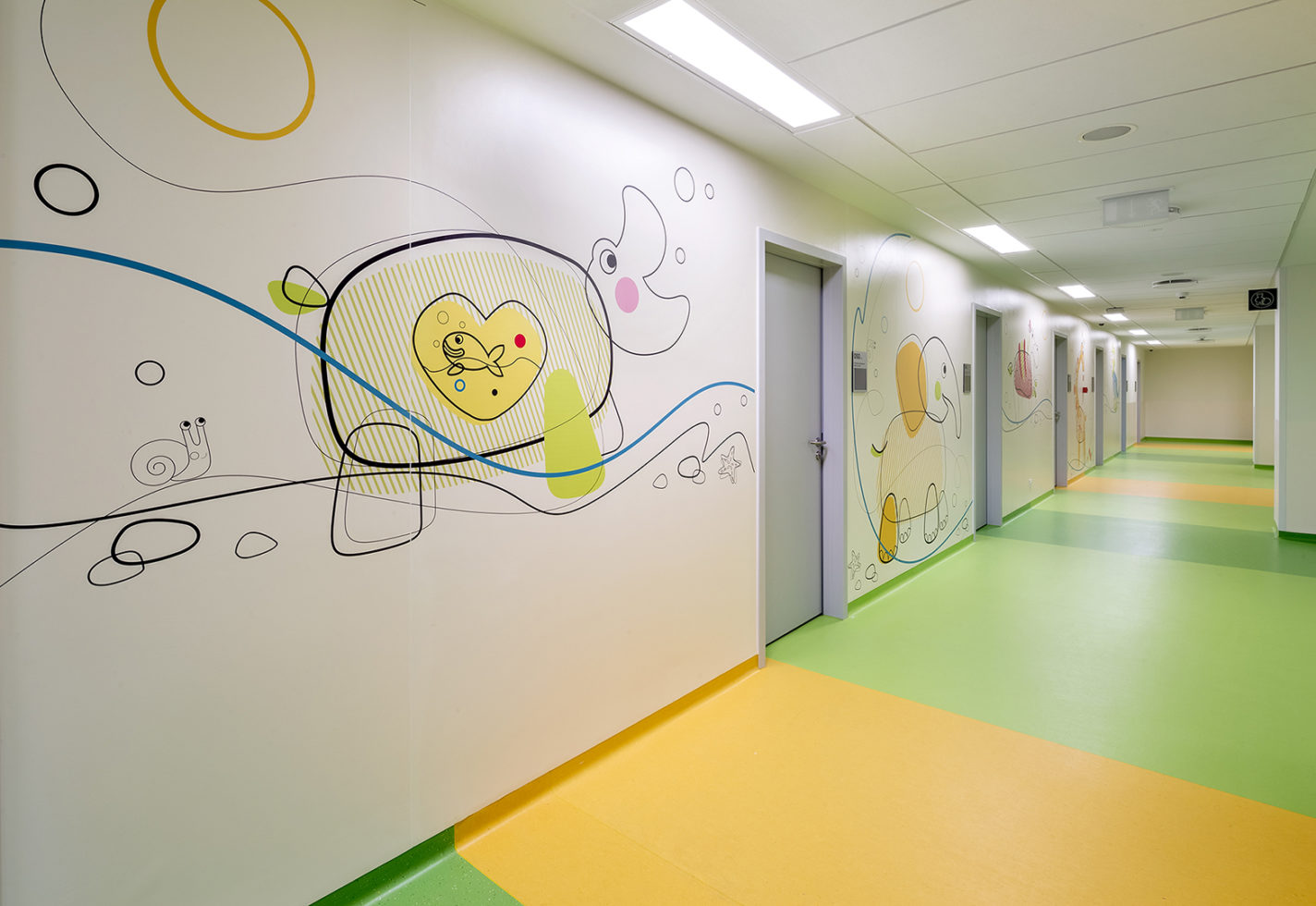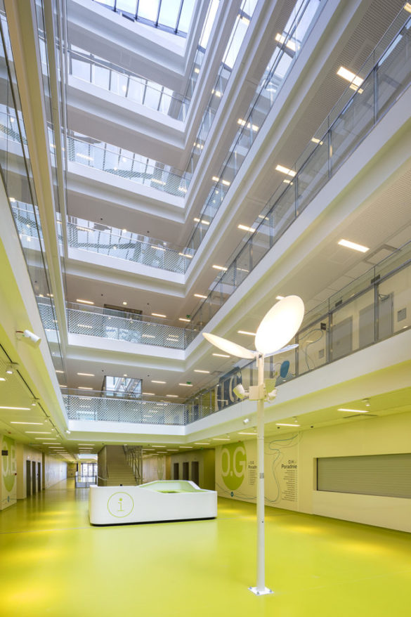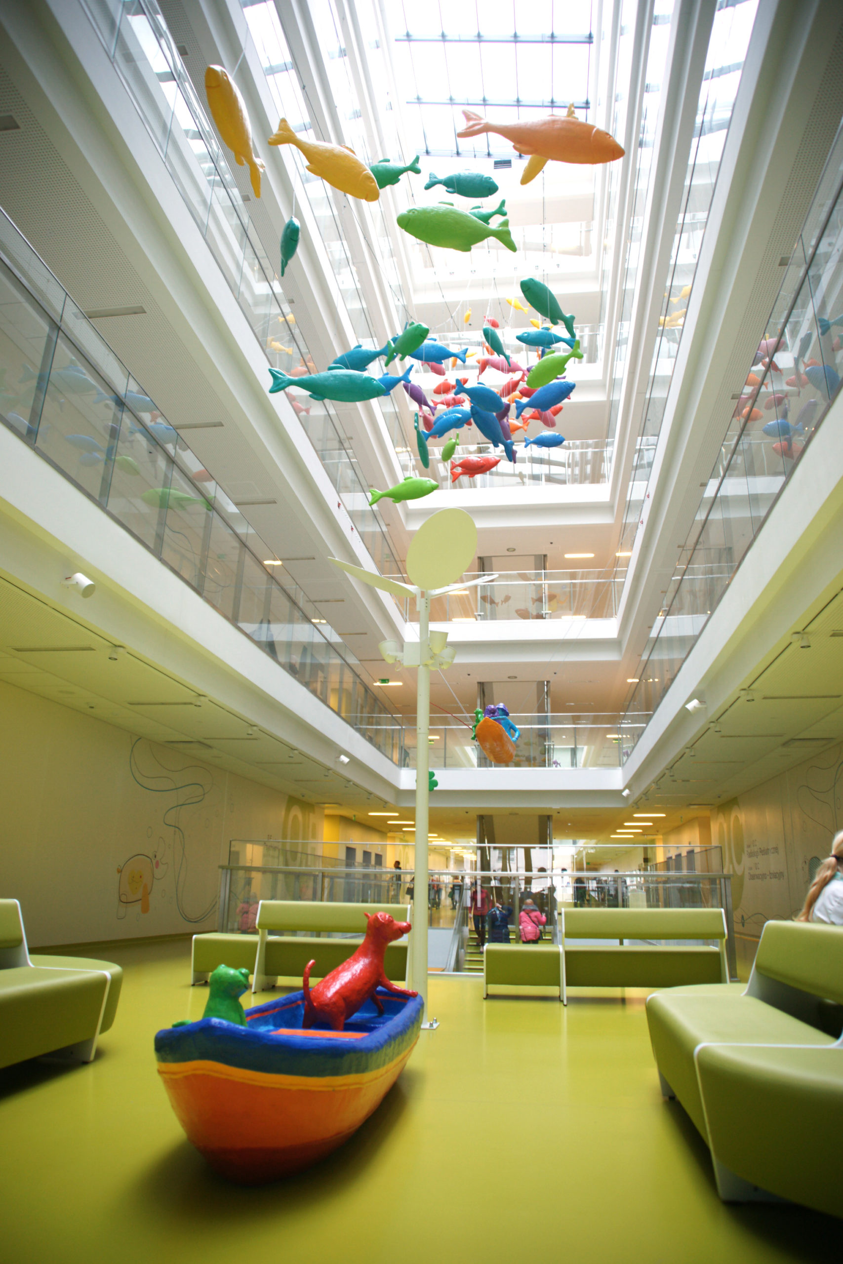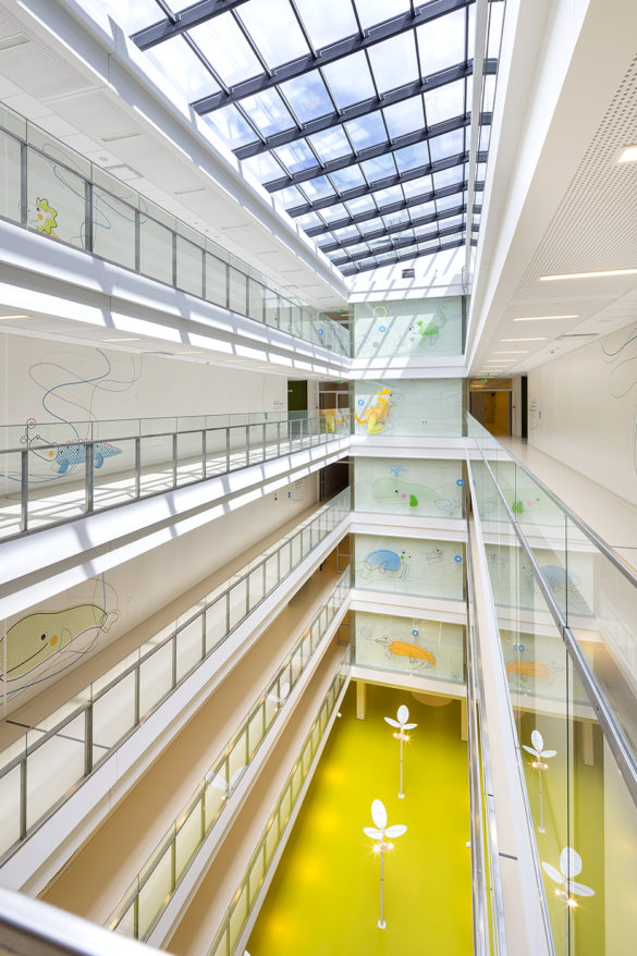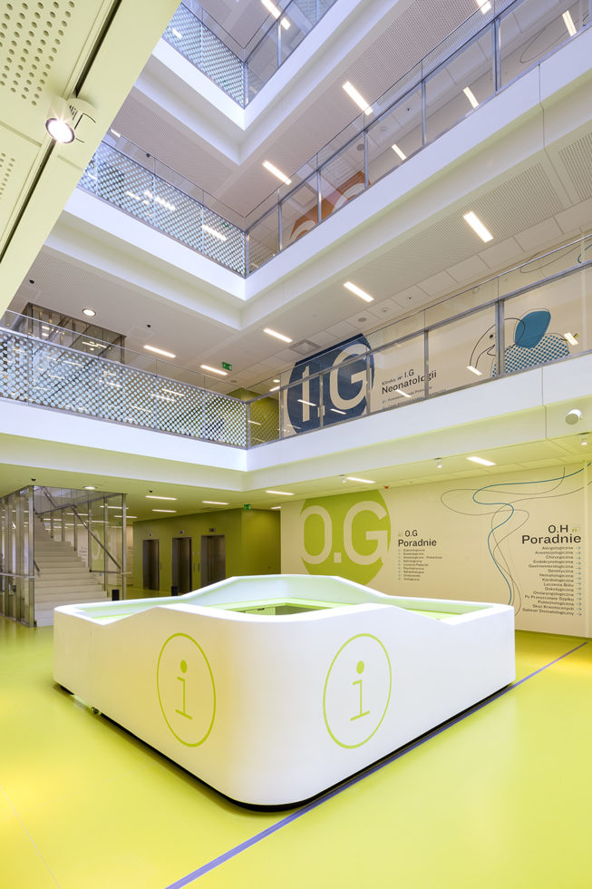 Bryłę budynku zaprojektowano w układzie krzyżowo-grzebieniowym. Przeszklony hol główny, scalający swą przestrzenią wszystkie kondygnacje nadziemne, łączy jednocześnie krzyżujące się z nim skrzydła oddziałów szpitalnych. Oprócz funkcji komunikacyjnej, hol pełni również rolę przestrzeni wypoczynkowej dla pacjentów oraz ich rodziców.