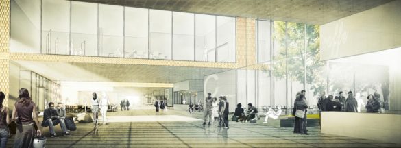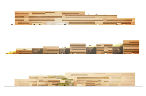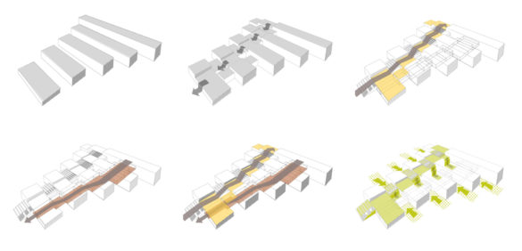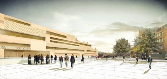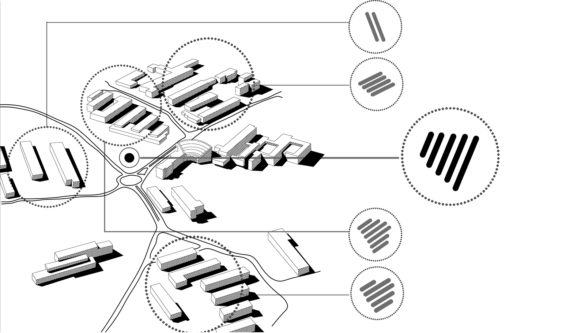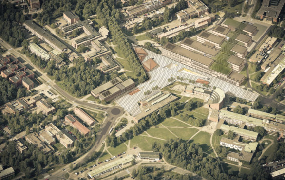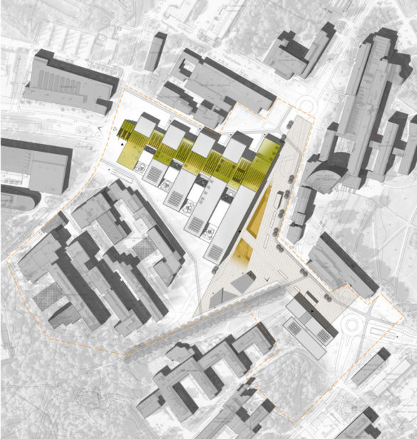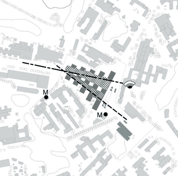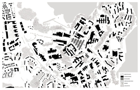 Całość kompozycji oparto na 2 osiach. Pierwsza to oś widokowa, wyznaczona śladem obecnej ulicy Otaniamentie z kulminacyjnym punktem w postaci Sali audytoryjnej dawnego budynku głównego. Druga oś wyznaczono jako oś komunikacyjną. Jej przebieg jest równoległy do przebiegu budynku biblioteki i łączy przestrzeń projektowanego placu centralnego z przyszłym terenem otwartym po ulicy Otaniamentie. Na tak wyznaczone osie naniesiono podstawowe elementy projektu.