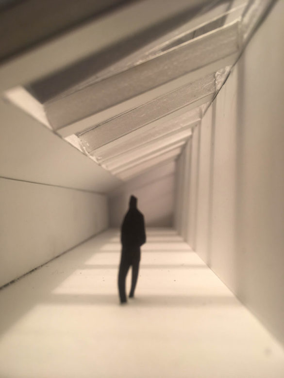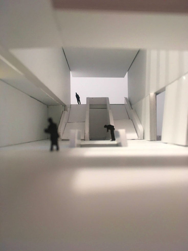 Rytuał wejścia do budynku zaprojektowano tak aby zaznaczyć wartość odwiedzanej przestrzeni, posłużono się kontrastem i elementem zaskoczenia. Do wnętrza prowadzi wąskie przejście na wysokość parteru, które otwiera się na przestrzeń cztero-kondygnacyjnego holu z górnym doświetleniem. Strefa holu wejściowego aby utrzymać wagę odwiedzanej przestrzeni i oglądanej sztuki stale przenika się ze ścieżką zwiedzania tak aby architektura mogła brać czynny udział w prezentacji sztuki, a nie ograniczać się tylko do zestawu następujących po sobie pomieszczeń, a holu tylko i wyłącznie jako komunikacji chwilowego pobytu.