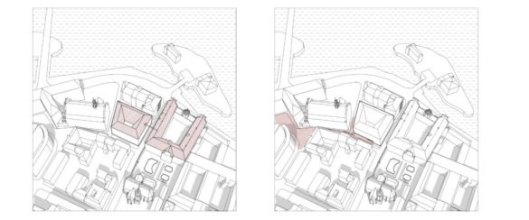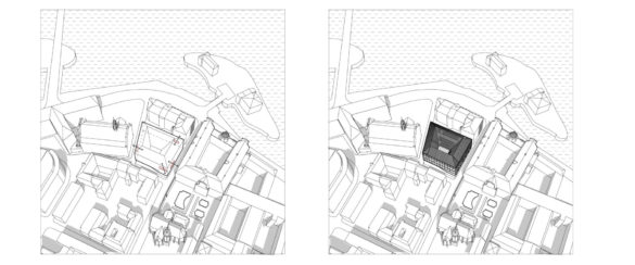 W tworzeniu zasady formowania budynku wzięto pod uwagę złożoność i wielowątkowość elewacji sąsiednich budynków, ich grę światłocieniem definiowaną głębokościami i fakturowością, rytmy i pionową artykulację. Gabaryty, wysokości gzymsów i kalenic zaprojektowano tak aby nie zakłócać odbioru zastanej przestrzeni, a spójnie i odpowiedzialnie wpisywać się w jej definicje. Na tym etapie nie określa się wprost materiałów i ich kolorystyki, jednakże przewiduje się ich zróżnicowanie w fakturach i odniesienie do materiałów otoczenia.