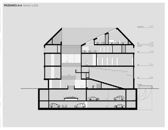 Uwzględniając wysokie partery sąsiedniej zabudowy podjęto ich reinterpretację w postaci prostych odbijających obraz płaszczyzn oplatających projektowany gmach.