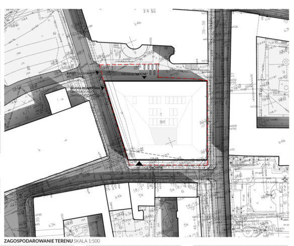 Analizując główne ścieżki którymi poruszają się piesi, na strefę wejściową obrano narożnik przy ul. Aleksandra hr. Fredry i plac Uniwersytecki. W poziomie parteru budynku ukształtowano plac wejściowy tak aby jego geometria kontynuowała perspektywę kościoła Uniwersyteckiego.