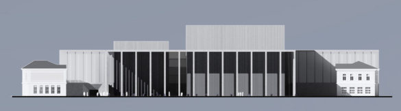 W tym celu zdecydowano się na wykreowanie zróżnicowanego charakteru nowego budynku. Fasada frontonu nowego Gmachu z wertykalnymi podziałami o zmiennym rytmie zdradza przeznaczenie obiektu. Definiuje również funkcję placu, z którego urządzono główne wejście. Od strony południowej (wewnętrznej) zdecydowano się na ograniczenie do niezbędnego minimum zarówno gabarytów jak i architektonicznych środków wyrazu projektowanego budynku tak, by nie dominował istniejącego założenia wpisując się w charakter układu zabudowy.