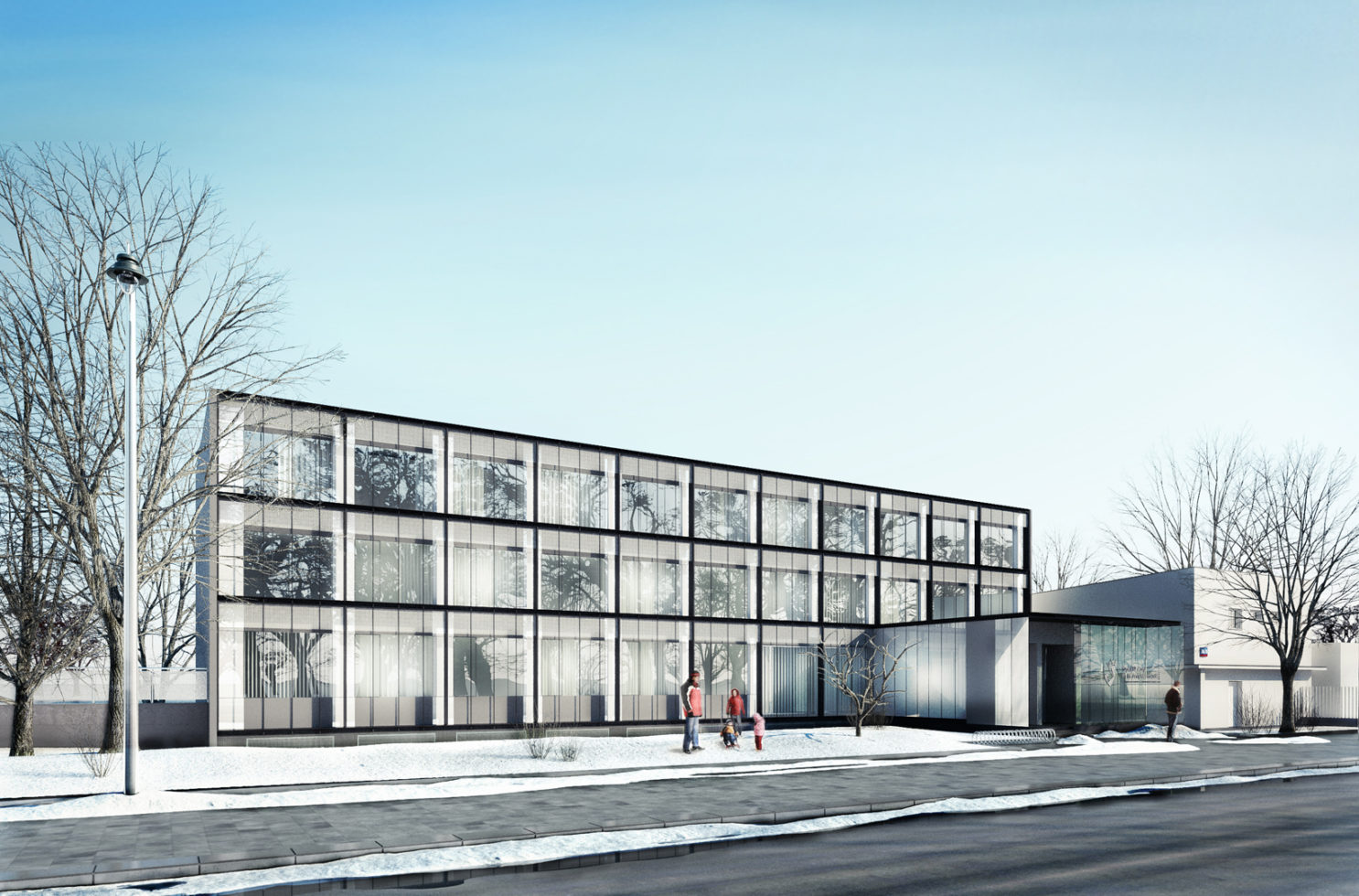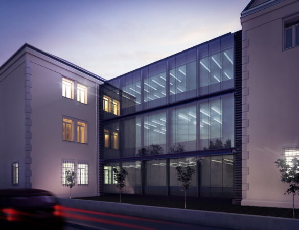 Zdecydowano się na zastosowanie współczesnych środków wyrazu architektonicznego jak i współczesnych materiałów w celu wyraźnego zróżnicowania obiektów, dzięki czemu nie zatracono możliwości odczytania historycznych elementów kompozycji. Zastosowanie szkła o pewnym stopniu refleksyjności, jako skóry zewnętrznej nowoprojektowanych kubatur pozwala wydobyć zabytkowy charakter istniejącej elewacji przy jednoczesnym stworzeniu doskonałych warunków izolacyjności akustycznej.