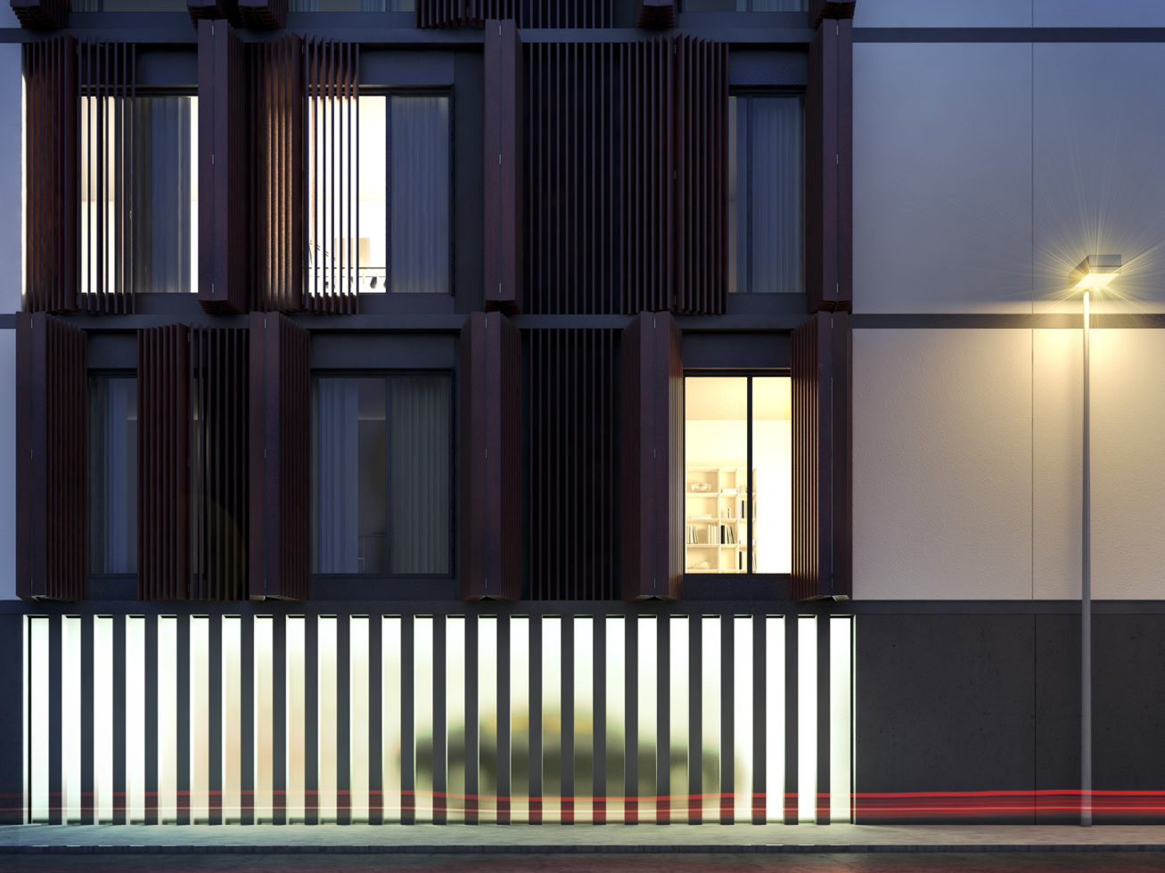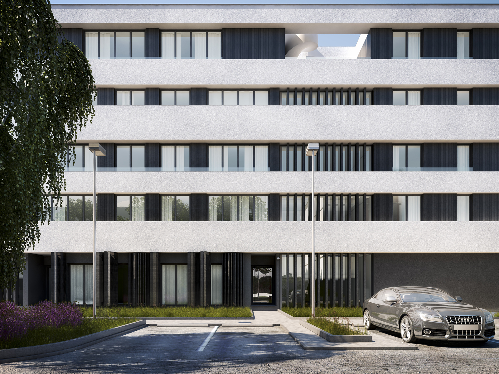 Użyte materiały nawiązują do architektury jachtów – biała okładziną pasów międzykondygnacyjnych oraz drewnianą okładziną wnętrz tarasów. Generalną zasada kształtowania budynku jest pasmowy układ kondygnacji oraz tworzenie wyrazistych pasów płyt balkonowych.