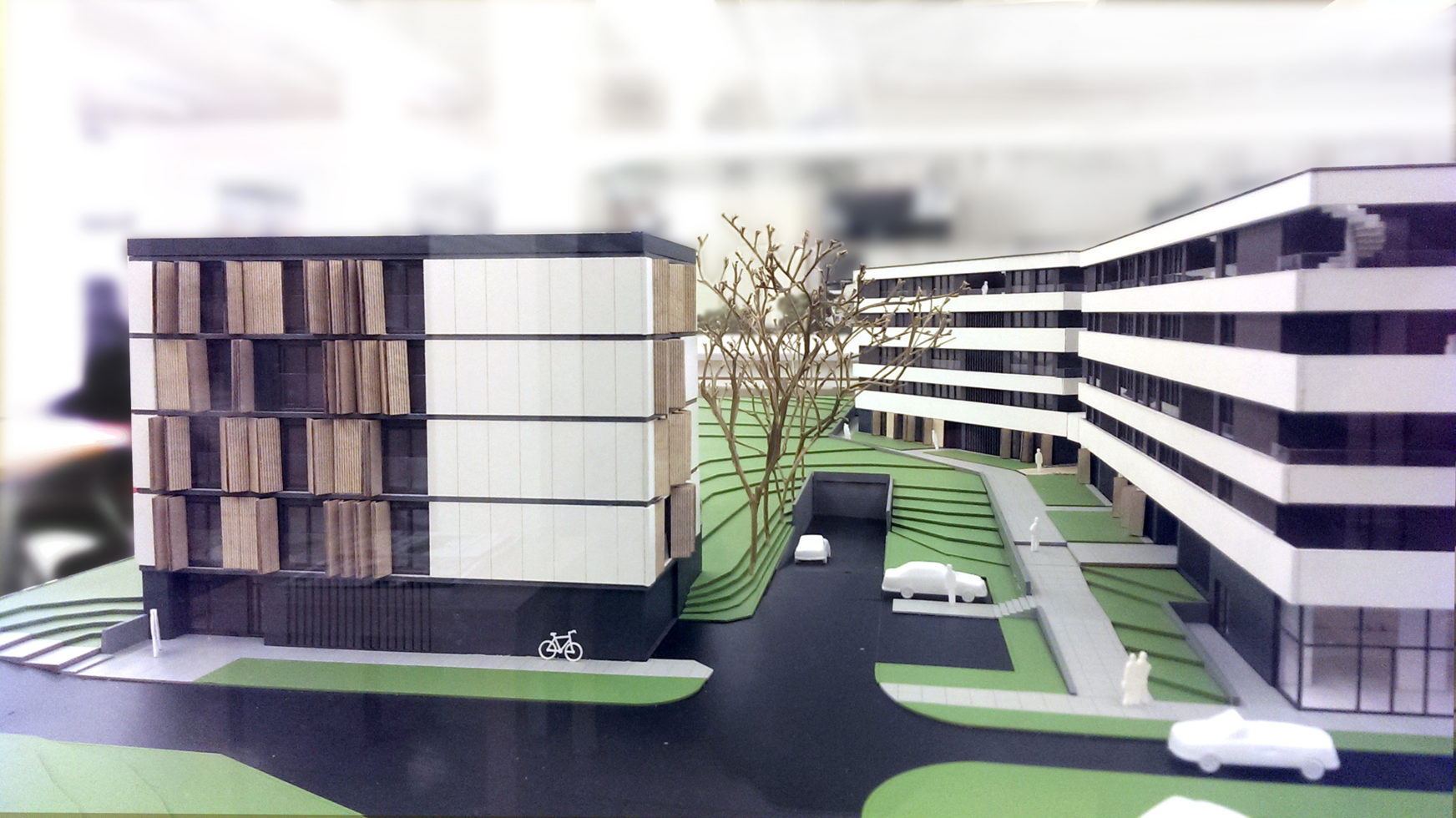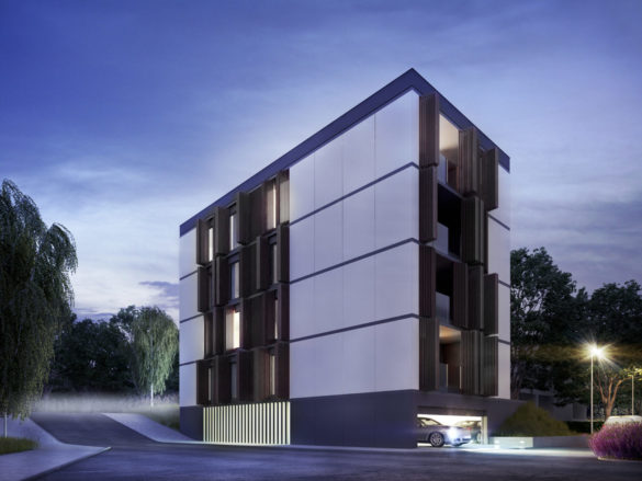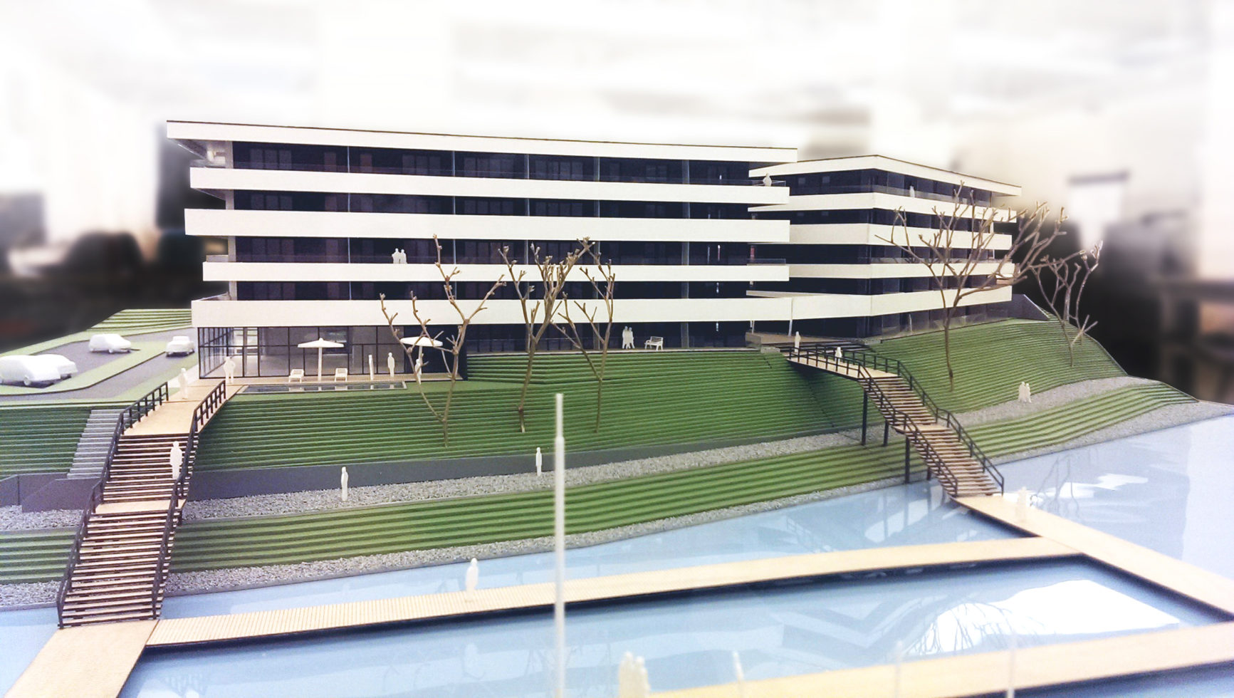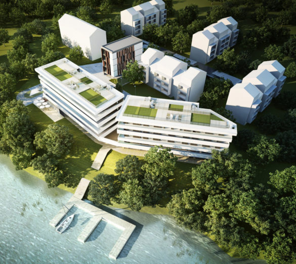 Przedmiotem opracowania jest projekt budowlany zespołu dwóch budynków mieszkalnych wielorodzinnych z parkingiem podziemnym znajdujących się nad jeziorem Zegrzyńskim. Pierwszy budynek, zlokalizowany w północnej części działki, ma cztery kondygnacje w całości przeznaczone na funkcję mieszkalną. Drugi, znajdujący się w południowej części opracowywanego terenu, składa się z dwóch cześć połączonych parkingiem podziemnym. Jego lokalizacja i kształt dostosowane są do jak największej ekspozycji w stronę jeziora. Dodatkowo załamanie bryły powtarza linię załamania skarpy, co sprawia, że budynek naturalnie współgra z krajobrazem. Budynki wysokością nie wyróżniają się spośród istniejącej zabudowy. Wszystkie mieszkania mają dostęp do tarasów z widokiem na jezioro. Ponadto mieszkania na najwyższej kondygnacji posiadają zielone dachy z wydzielonymi tarasami.